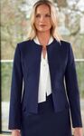 54% Polyester, 44% Wool, 2% LYCRA® Elastane. Tailored fit, collarless styling with curved splits, 2 internal jet pockets, curved front/back seams.